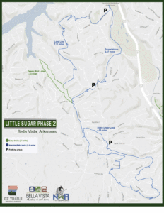 Like the Back 40 trail system, which consists of an outer loop with additional miles of trails crisscrossing the interior, the third phase of construction on the Little Sugar trail network will create the same kind of scenario. That phase includes a technical trail that is being built by another Arkansas-based trail building company, Jagged Axe Trail Designs.