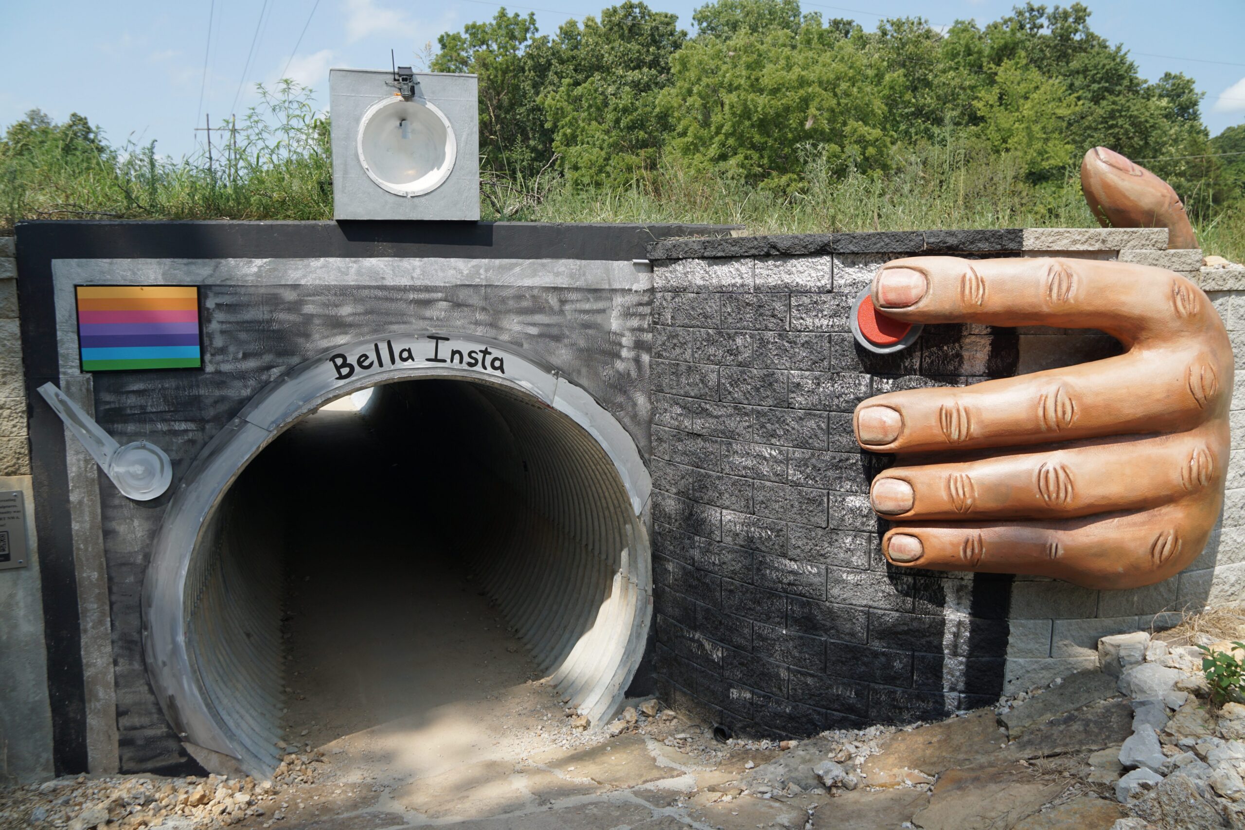 On the other side of the highway, off Chelsea Road, is Bella Insta. A sculpture hugging the sides of the Tweety Bird Trail access tunnel to Little Sugar mimics a hand taking a picture with a camera. The artist, Stephen R Feilbach, installed a game camera into the sculpture that captures cyclists riding through the trail.