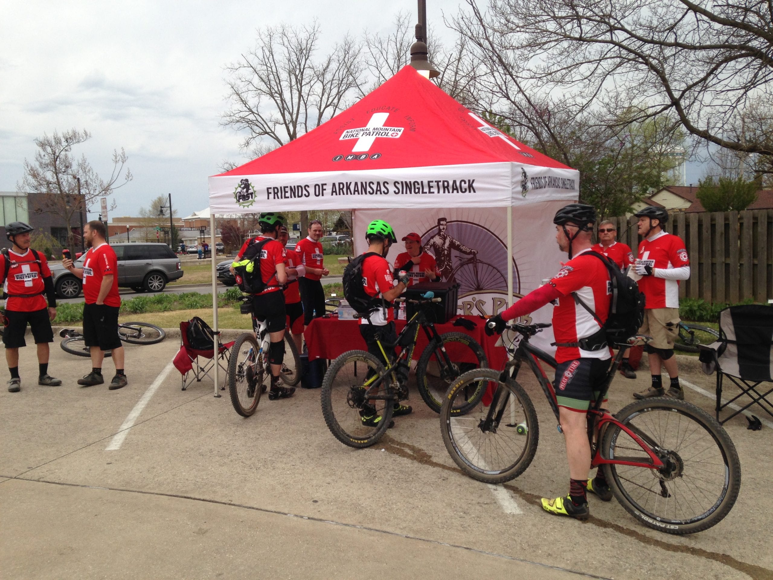 Five years ago, Kelly approached the International Mountain Bicycling Association (IMBA) and rallied ten friends to start what was known as the National MTB Patrol. The unit was trained in first aid, CPR, and trailside bike repair. The patrol unit grew to provide trailside assistance to local riders. However, when IMBA decided to turn the National MTB Patrol over to the National Ski Patrol, local patrollers voted to go private and OZ MTB Patrol was born. “As we grew and as this area grew [OZ MTB Patrol] became something different,” says Williams. Originally, these medics and mechanics patrolled around town, but as the Bentonville racing scene grew, the OZ MTB Patrol saw an opportunity to serve this community by being present at scheduled races. Their presence was welcomed by race officials and riders. “We’re on the trails while they’re racing and we have a tent set up at the finish line,” says Williams.