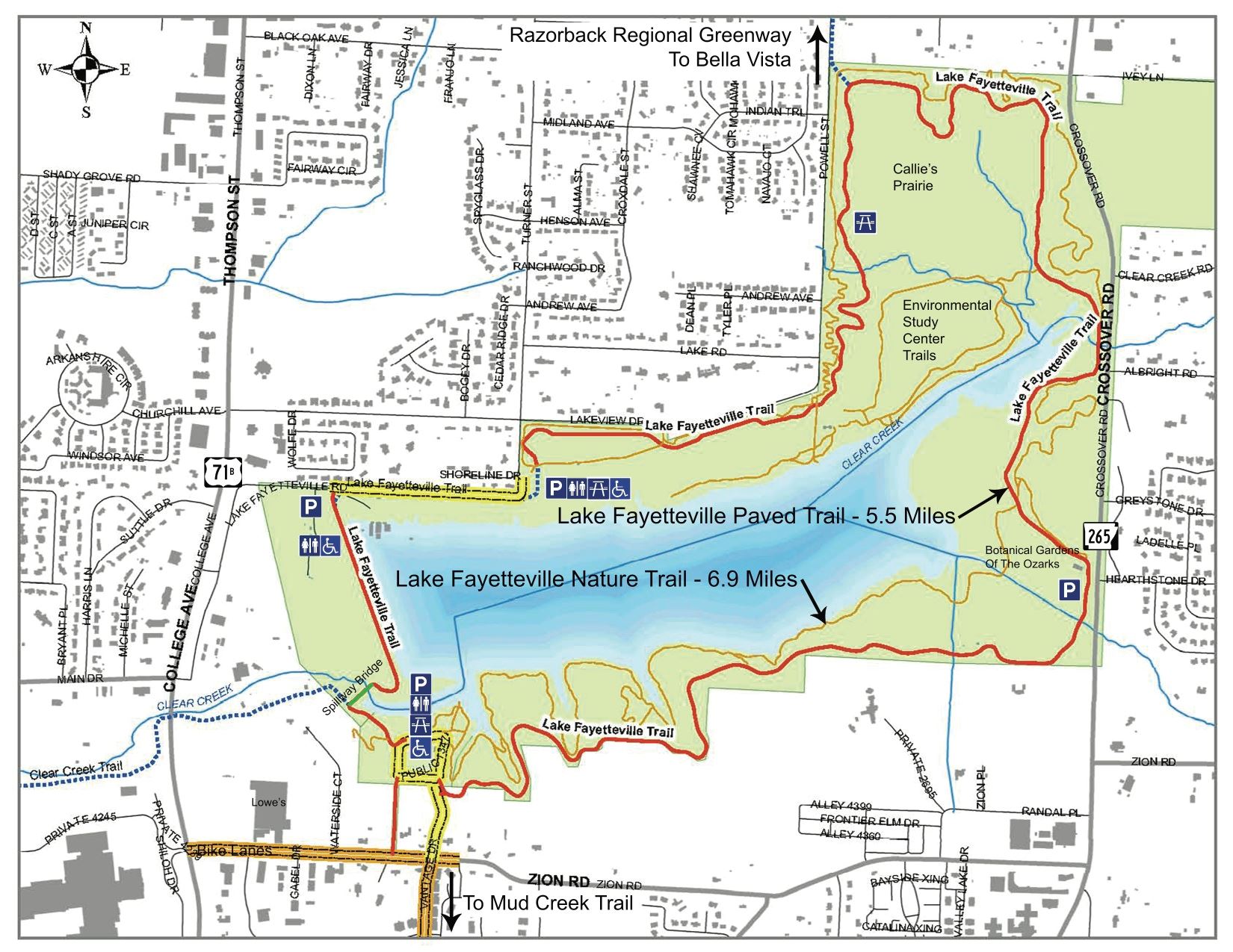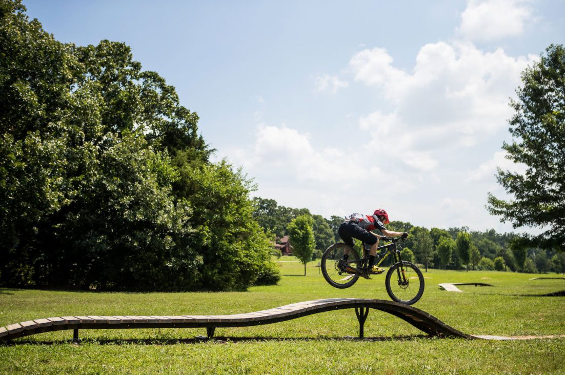 Lake Fayetteville is a local favorite for beginning mountain bikers, with 7 miles of singletrack and an additional 5 miles of paved trails. This scenic trail system offers stunning views of the lake and is quickly accessible from the Razorback Greenway. The park also features a popular disc golf course and a food truck plaza. Check out the University of Arkansas campus and famous Dickson St. entertainment and arts district while you’re in town. For more information, visit Experience Fayetteville.