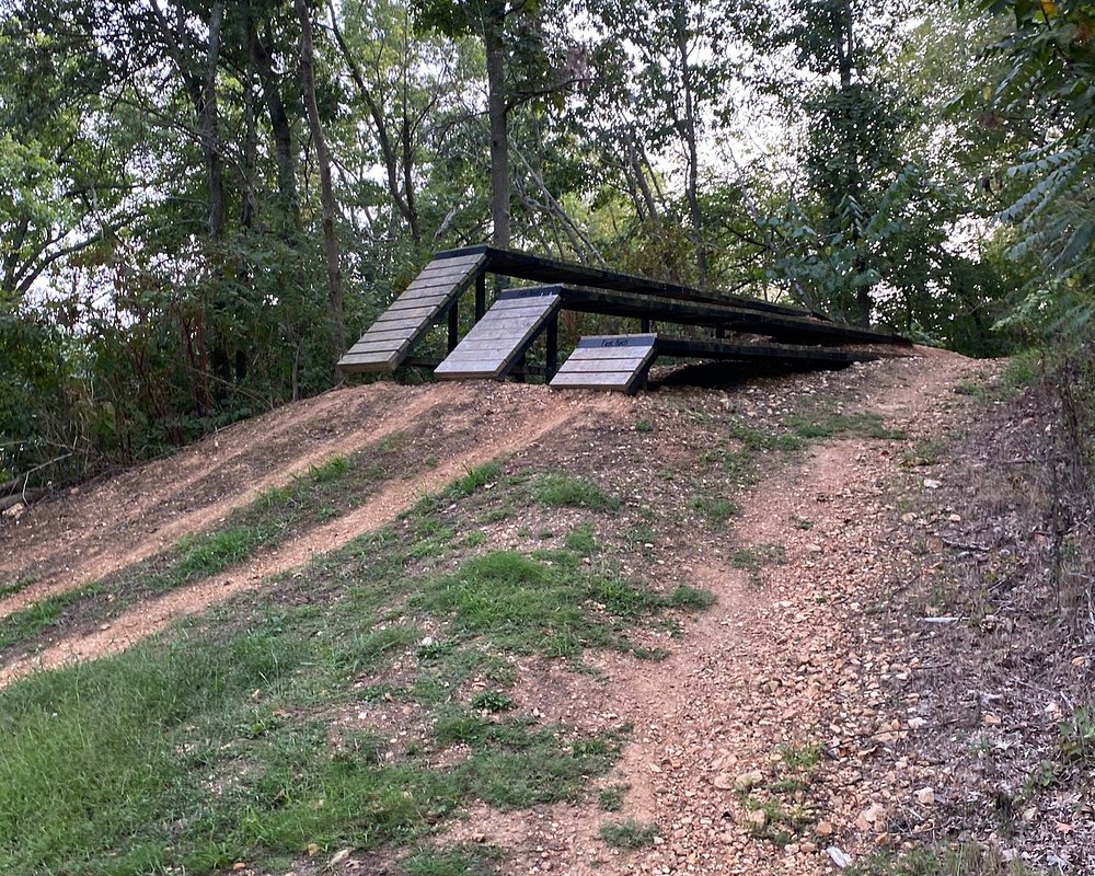City Lake trail system is north of Siloam Springs on the City Lake property owned by the City of Siloam Springs. There are 3 trails that add up to 3.2 miles of punchy climbs, flowing singletrack and fun descents. Add in a few alternate lines that you can mix in to get some air. When you finish the loop turn around to ride the opposite direction and it feels like a whole new 3.2 miles. On the west side of the property, Simons Descent begins at the top of the hill and is sure to make you smile. With a large starting deck, several rollers, a step up, nice bermed corners a couple of wall rides and finishing off with an option to pick your drop back into the lot, this trail packs a lot of features. If you choose you can continue across Taylor Orchard Rd (to the south) and ride The Enchanted Forest trail down to the 505’ long elevated canopy boardwalk for fantastic views of the watershed. Continuing on the Enchanted Forest will lead you to the ADA trail which makes a loop around the field and leads to the Bicycle Skills Course and paved pump track.