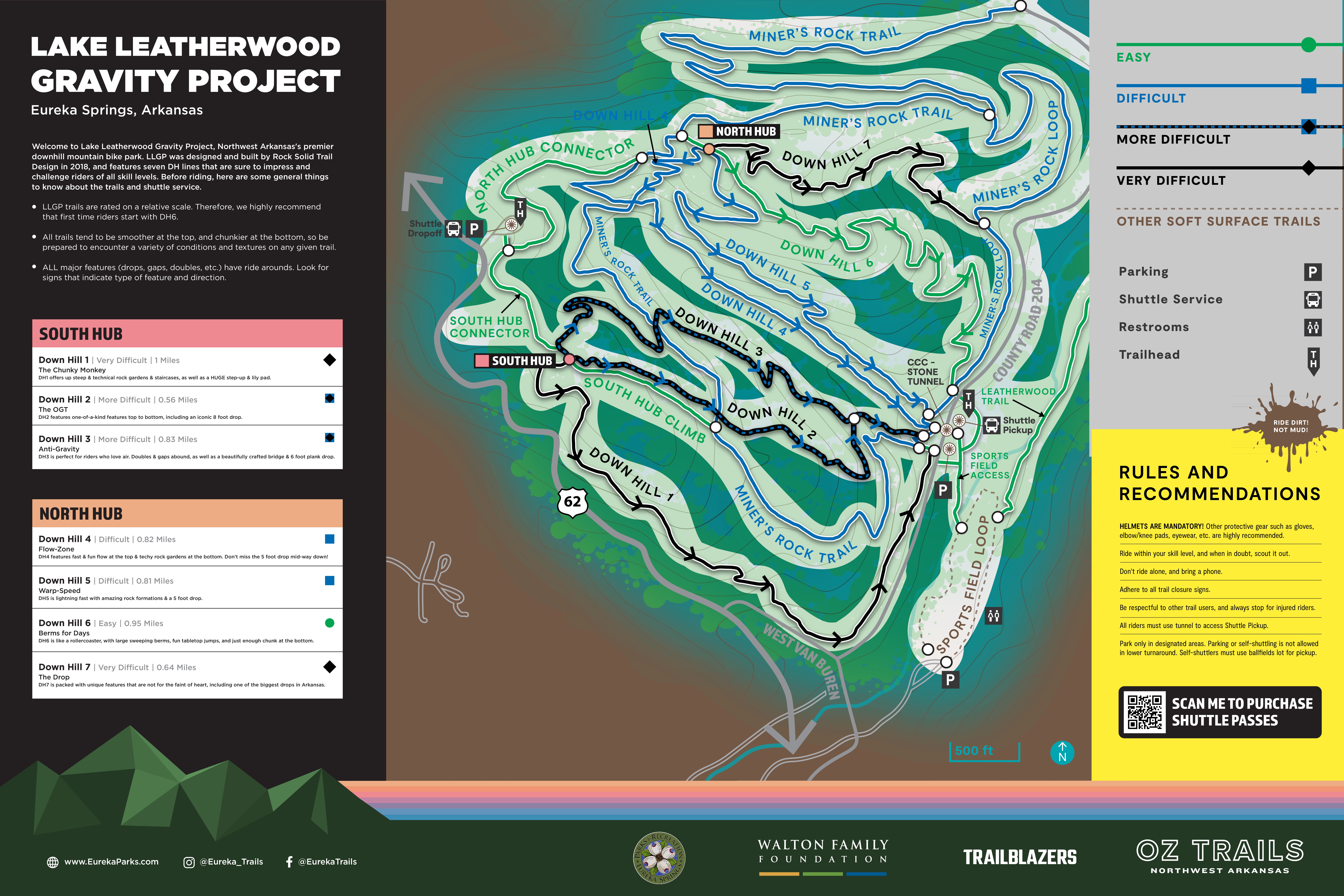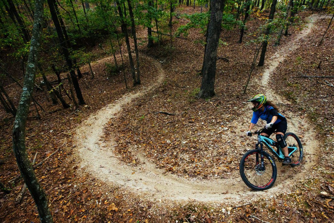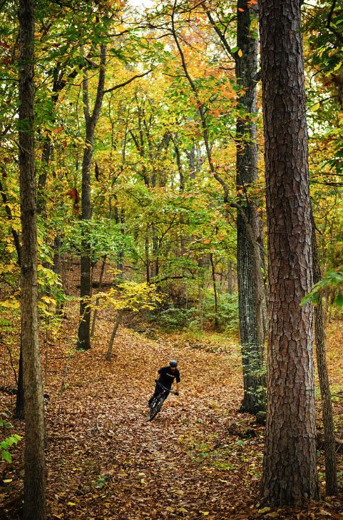 The steep and ledgy hillsides of Lake Leatherwood trails make the Eureka Springs park ripe for downhill-only trails. There are seven of them, each about a mile long. For a fee, which goes to maintaining the trails, a shuttle sprints riders and their bikes up the mountain to two stone platforms that serve as the launching pads for each descent. There are smooth, flowing trails for beginners, technical rocky downhills for intermediate riders, and massive jumps and drops for the experts, including the so-called “lily pad.” You’ll know it when you see it. Hint: it’s on Downhill One, and it’s big.