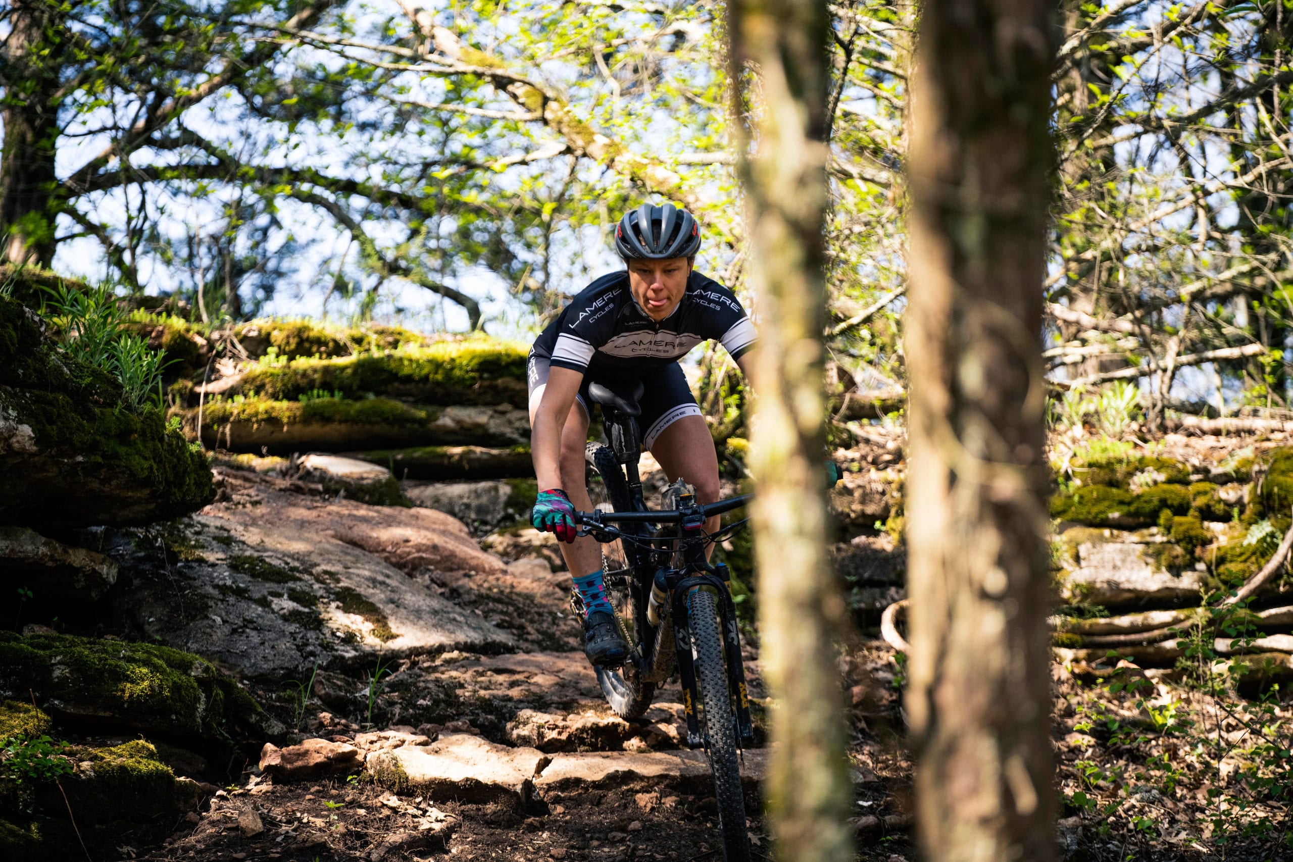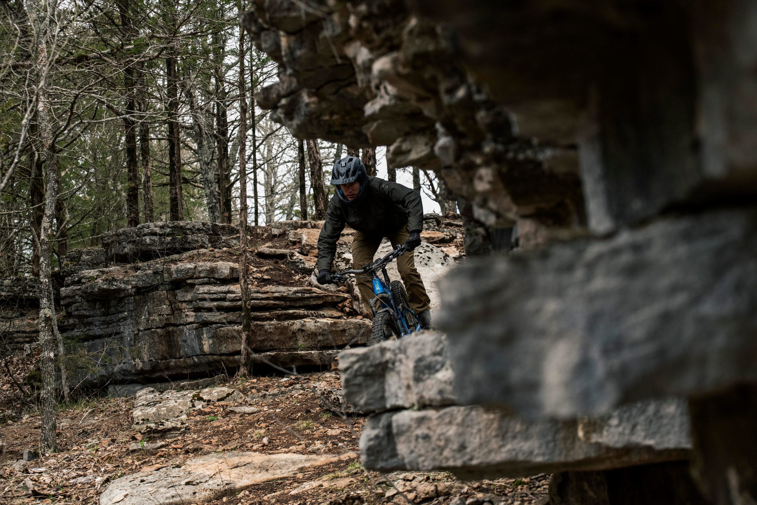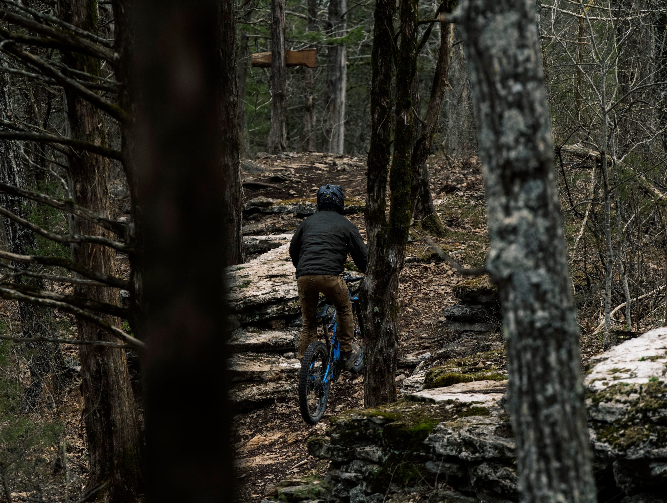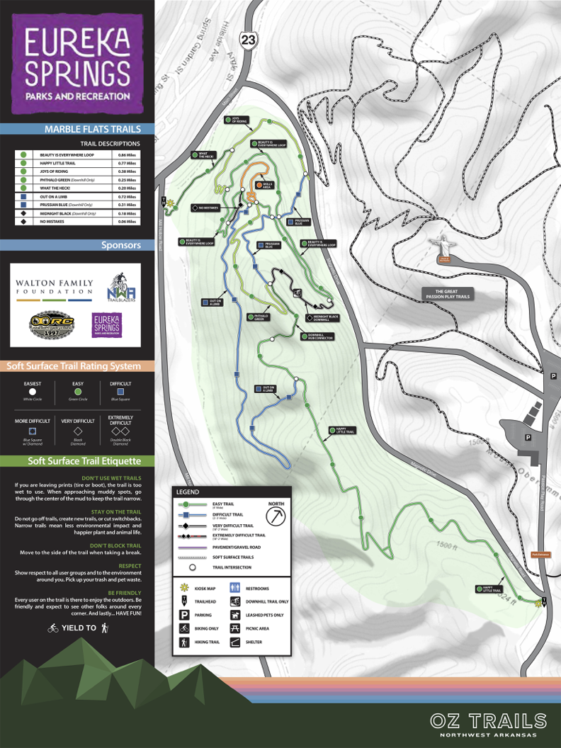 If you can’t get enough of the trails Jagged Axe Trail Designs built at the Passion Play in Eureka Springs, just jump across Magnetic Drive from the Passion Play entry gates to an area known as Marble Flats. There you’ll find a five-mile trail system packed with three short, but memorable downhill runs a skills area, and a bridge you’ll want to snap a photo of. To get to the main hub, you’ll have to take a jaunt down Happy Little Trail, which is exactly what it sounds like with wavy rollers and an optional gravity cavity step-up. From there take the hub connector to get to the Phthalo Green, Prussian Blue, and Midnight Black downhill lines.